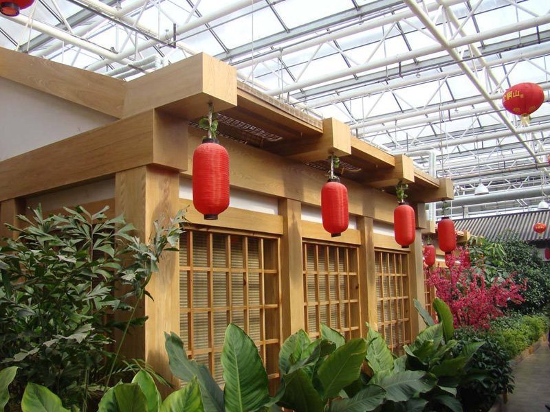 綠色生態(tài)餐廳中廳采用大型鋼結(jié)構(gòu)形式,跨度大,高度高、可植入高大樹木,設(shè)置亭臺,造景時有更大的發(fā)揮空間,使景色更加逼真。中廳周圍設(shè)置其他配套連棟溫室,大部分餐飲設(shè)置于其中,降低大大的造價和后期維護費用,同時保證了充足的活動空間,美景美食交相輝映,相得益彰。