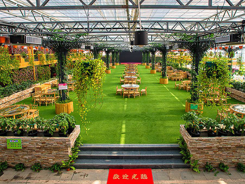 綠色生態餐廳中廳采用大型鋼結構形式,跨度大,高度高、可植入高大樹木,設置亭臺,造景時有更大的發揮空間,使景色更加逼真。中廳周圍設置其他配套連棟溫室,大部分餐飲設置于其中,降低大大的造價和后期維護費用,同時保證了充足的活動空間,美景美食交相輝映,相得益彰。